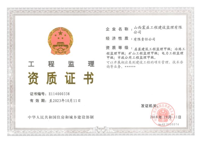山西震益工程建設監理有限公司【原太原鋼鐵(集團)工程建設監理有限公司】成立于 1998年4月,注冊資金 600 萬元,是******批準的具有甲級執業資質的綜合性工程咨詢服務企業,具有冶煉工程、電力工程、礦山工程、房屋建筑工程、市政公用工程等5個工程監理甲級資質和設備監理甲級資質。主要業務涉及冶金、房屋建筑、礦山、電力、市政、機械、環保等領域的工程建設監理、設備監理、工程咨詢、造價咨詢、檢測試驗等。公司建立了質量ISO9001:2015標準、環境ISO14001:2015標準、職業健康******GB/T28001-2011 idt OHSAS 1800:2007標準 “三標一體”管理體系,是中國設備監理協會常務理事、中國冶金建設監理協會常務理事和山西省監理協會副會長單位。